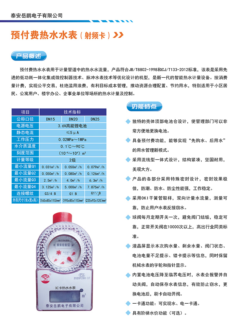 預(yù)付費(fèi)熱水表用于計(jì)量管道中的熱水水流量,產(chǎn)品符合JB/T8802-1998和tCJ/T133-2012標(biāo)準(zhǔn),預(yù)付費(fèi)熱水表采用先進(jìn)的低功耗一體化集成微控制器技術(shù),脈沖水表技術(shù)等優(yōu)化設(shè)計(jì)的機(jī)型,是新一代的智能熱水計(jì)量設(shè)備,按消費(fèi)量計(jì)費(fèi),實(shí)現(xiàn)公平交易,杜絕濫用浪費(fèi),有利目標(biāo)成本管理,推動資源合理配置,節(jié)約用水,特別適用于小區(qū)居民,公寓用戶,樓宇辦公,企事業(yè)單位等場所的熱水計(jì)量及控制。